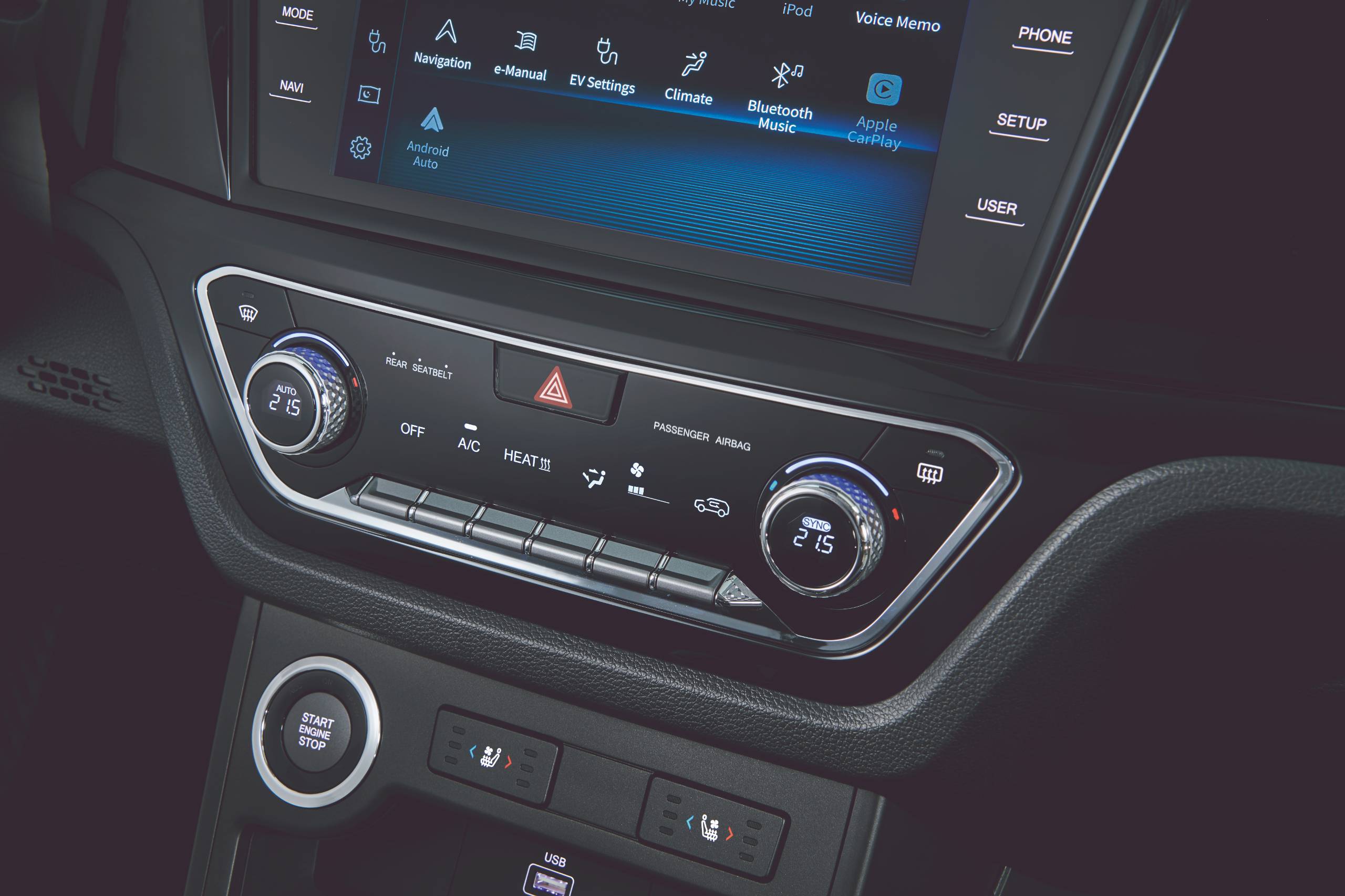 The “Blaze Cockpit” offers a distinctive blend of cutting-edge design and aesthetic appeal. Its roomy interior features a captivating 34-color infinity mood lamp and a 12.3-inch fully digital center gauge cluster, seamlessly mirroring the AVN screen to create an enjoyable and engaging driving experience. The e-Motion seats provide total comfort with multi-density foam cushions that support your shoulders, back, and key pressure points, while offering ample space for easy entry and exit.